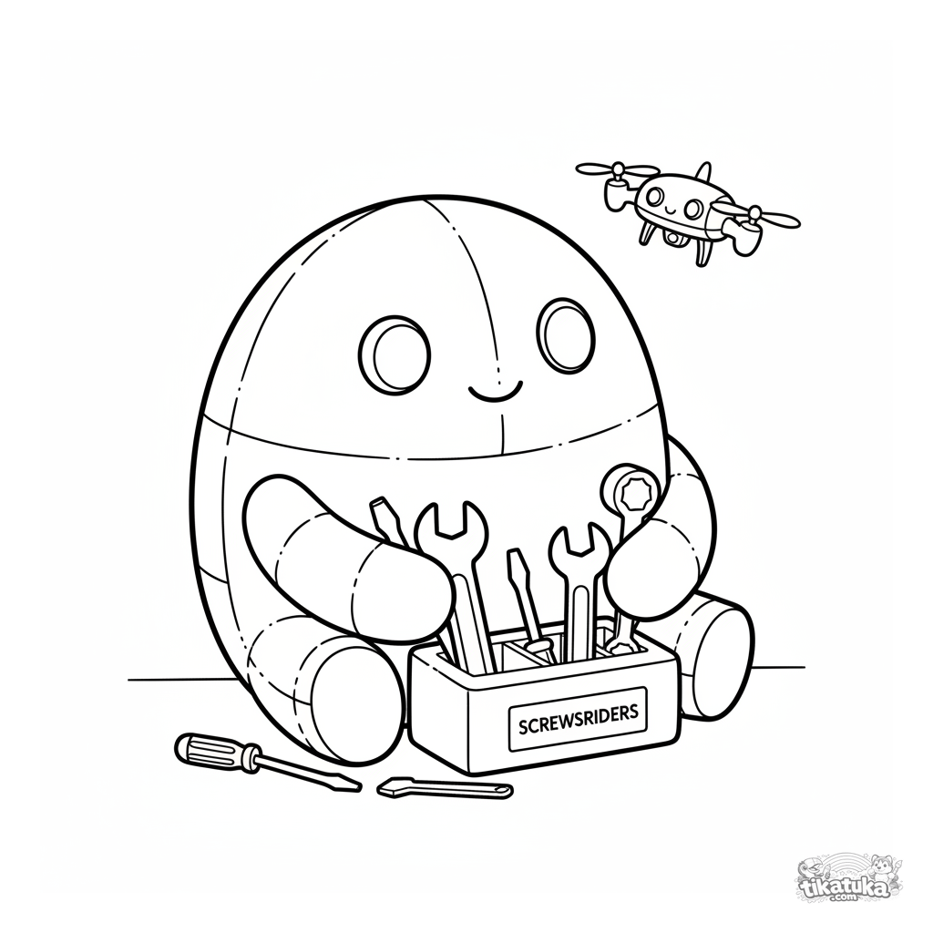 Простая раскраска для малышей 2-3 лет: плюшевый робот-талисман на складе. Огромные, дружелюбные формы, минимум деталей — безопасно и весело раскрашивать.