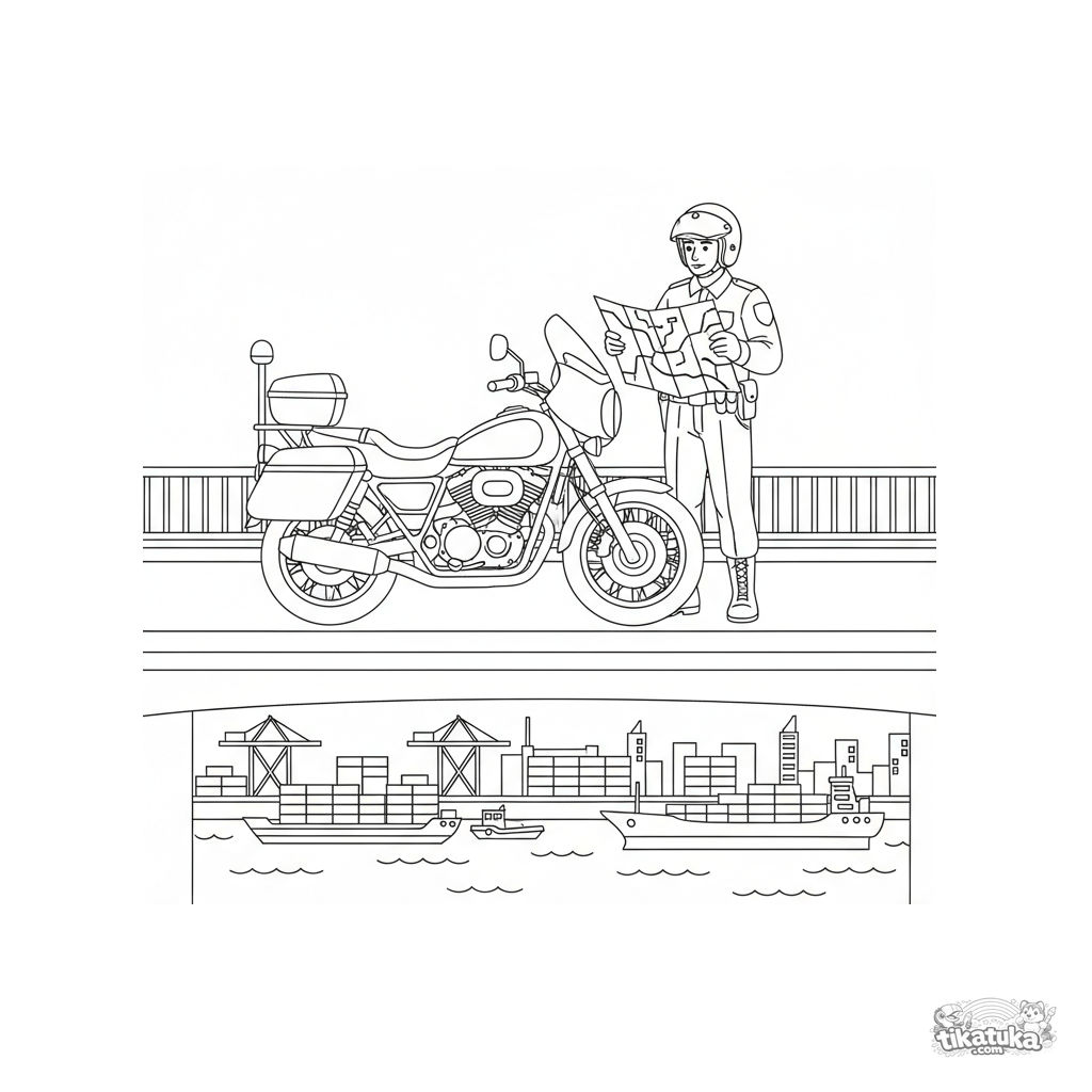 Раскраска для детей 7-9 лет: полицейский мотоцикл на патрулировании моста над рекой. Детализированная сцена с фигурой офицера, развивающая аккуратность.