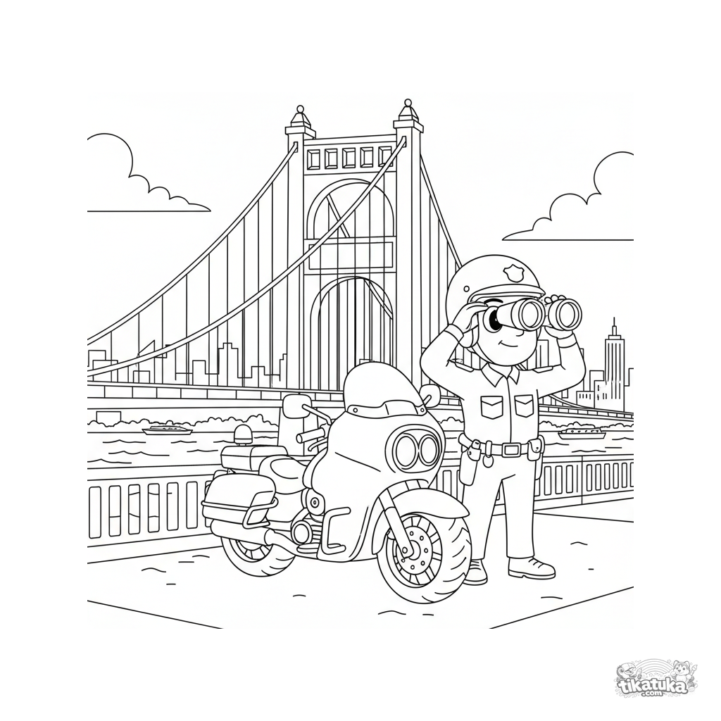 Раскраска для детей 7-9 лет: полицейский мотоцикл и офицер на страже на большом висячем мосту над рекой. Динамичный стиль 80-х.
