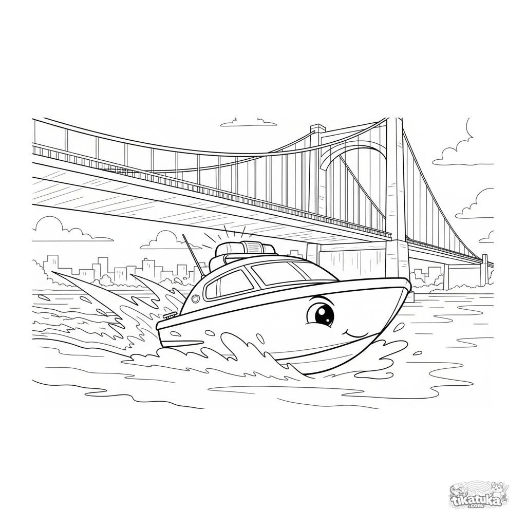 Раскраска для детей 7-9 лет: полицейский катер в погоне под огромным мостом над рекой. Динамичная сцена в стиле 80-х для увлекательного раскрашивания.