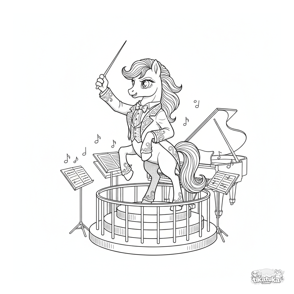 Детальная раскраска в стиле старинной гравюры с пони-дирижёром в оркестровой яме театра. Для детей 10-12 лет. Сцена с пультом, нотами и фортепиано.