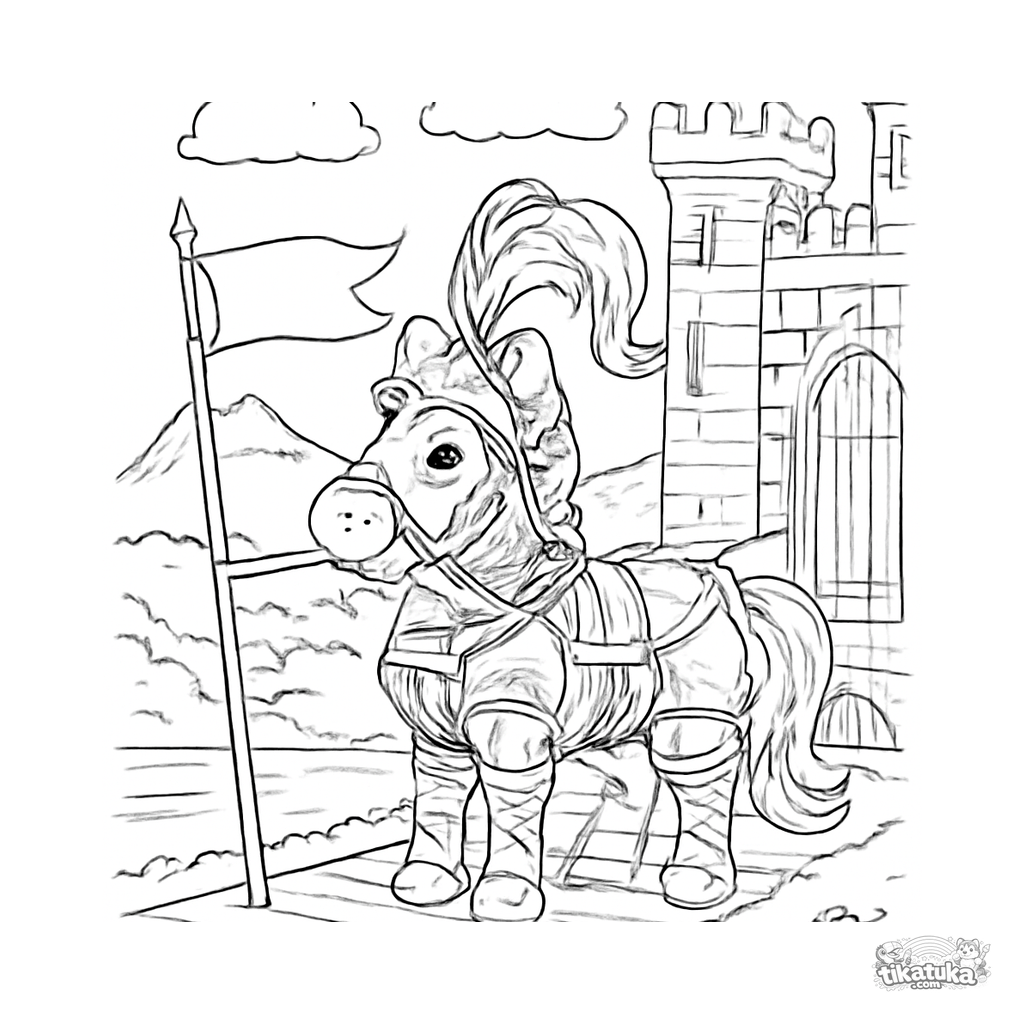 Раскраска для детей 8-12 лет. Отважный черный пони в сверкающих серебряных доспехах стоит на страже у разводного моста каменного замка с флагом. Скачать бесплатно.