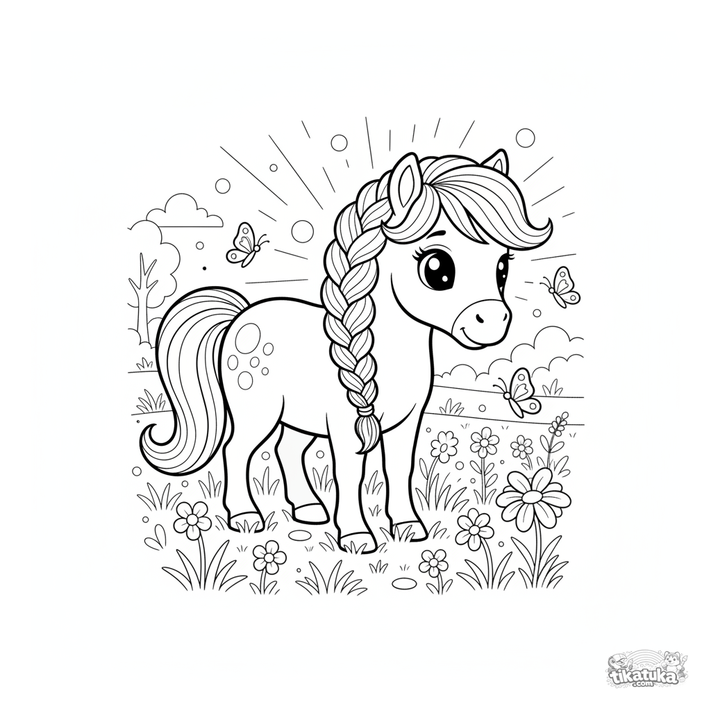 Раскраска для девочек 4-6 лет: милый пони с заплетённой гривой пасётся на лугу, полном диких цветов и бабочек. Спокойная сцена для раскрашивания.