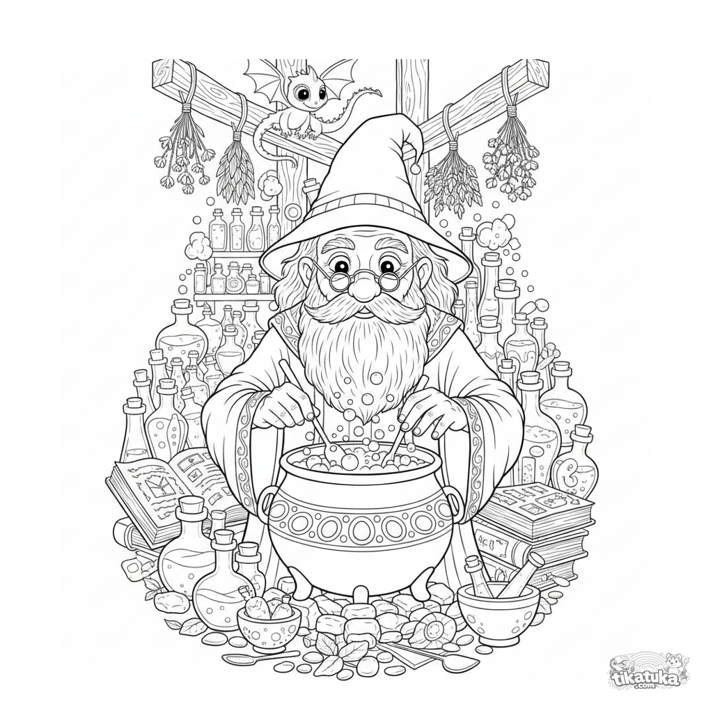 Детализированная раскраска в народном стиле для детей 10-12 лет: мастер зелий за работой на уютном чердаке, полном странных предметов. Много элементов для раскрашивания.