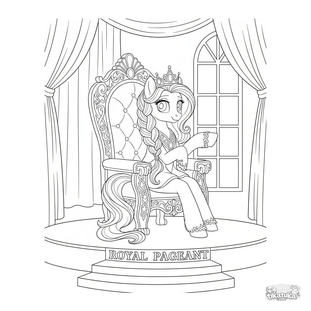 Детальная раскраска для детей 10-12 лет: реалистичная принцесса-пони в короне обращается к зрителям с трона на сцене. Сложная прорисовка украшений, мантии и декораций.