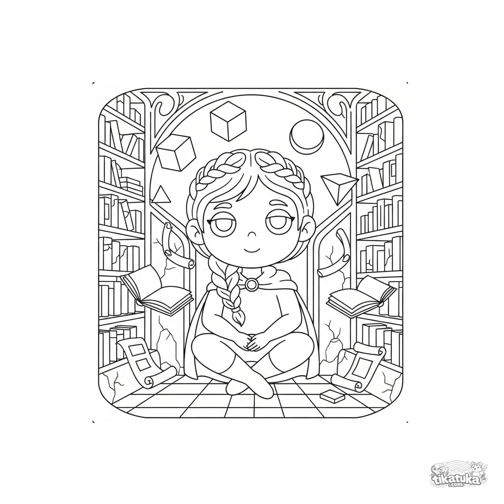Раскраска для детей 7-9 лет: герой с психическими силами парит в воздухе среди полок древней библиотеки, окружённый парящими книгами и геометрическими фигурами.