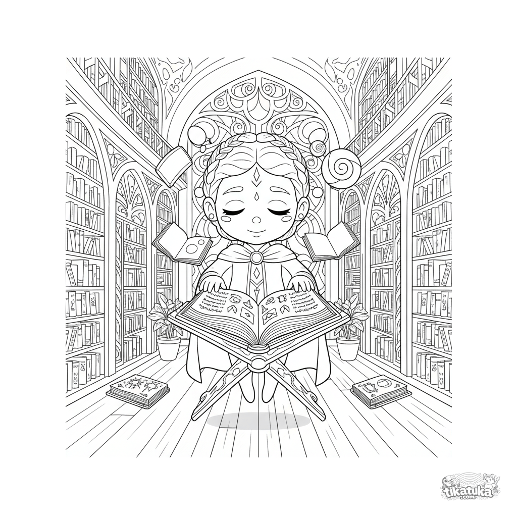 Раскраска для детей 7-9 лет: супергерой-психоник парит в старинной библиотеке, изучая древний фолиант, вокруг головы летают геометрические фигуры. Загадочная сцена.