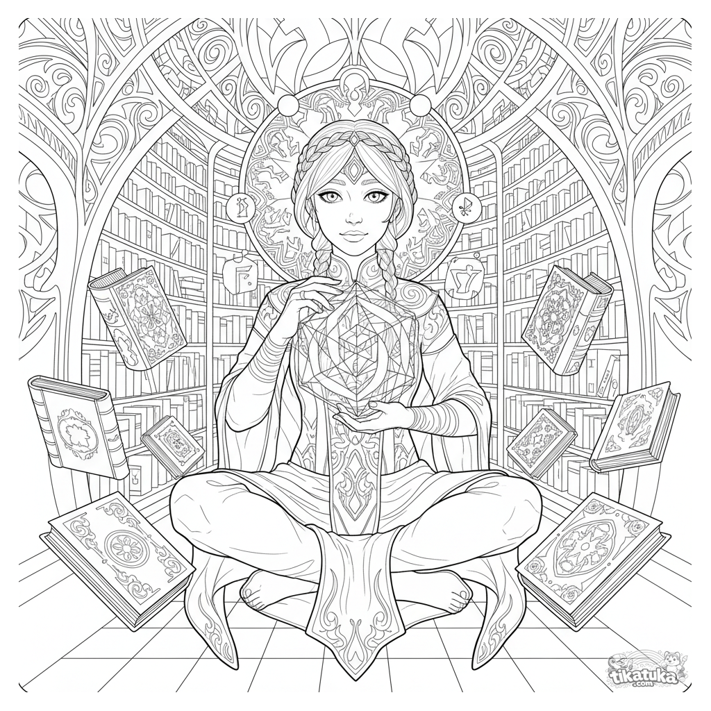 Раскраска для детей 10-12 лет: супергерой-психоник использует силы разума, чтобы собрать светящуюся головоломку в парящей волшебной библиотеке. Сложные детали.