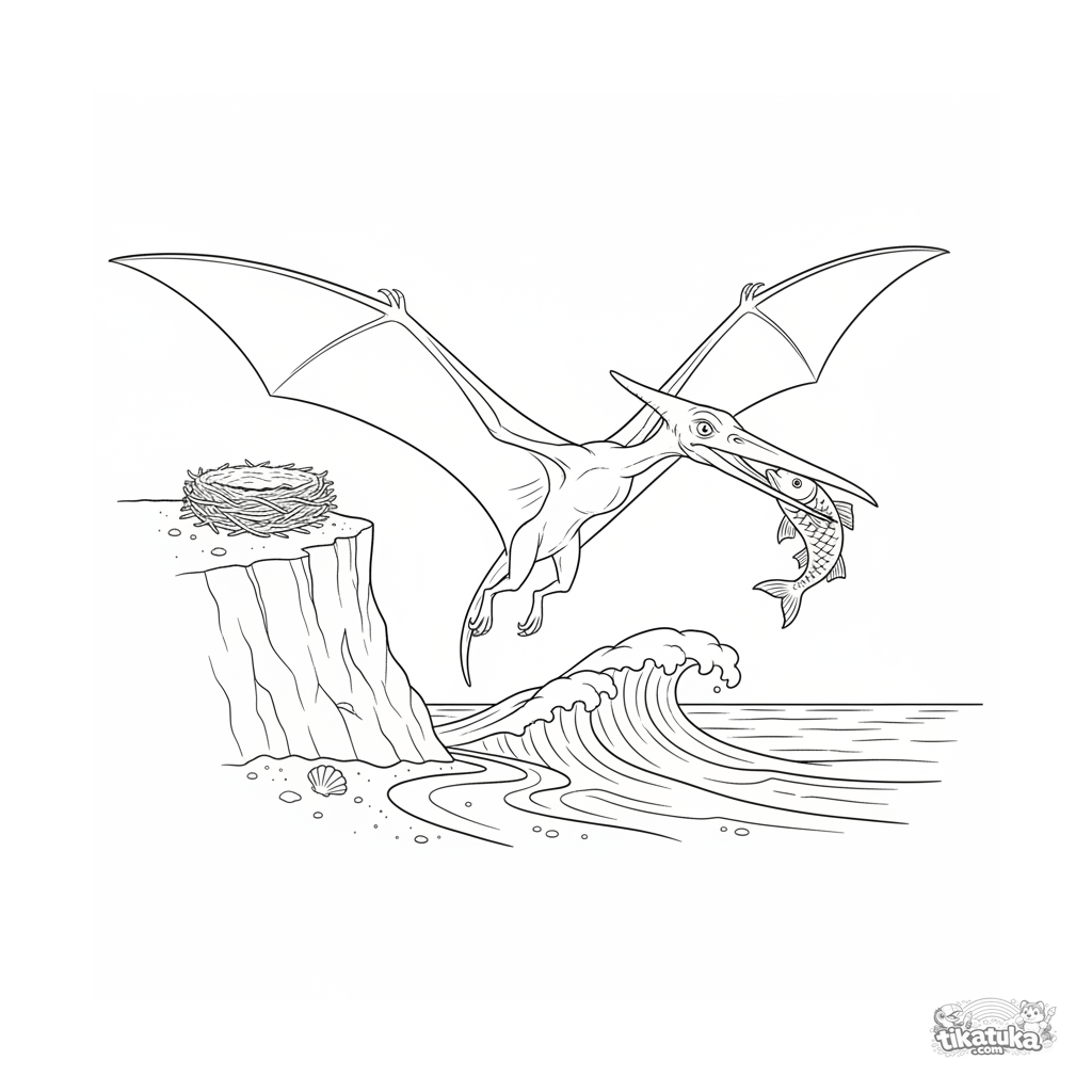 Раскраска для детей 7-9 лет: птерозавр летит над волнами древнего океана, неся рыбу к своему гнезду на песчаном утёсе. Умеренная детализация, выразительный фон.