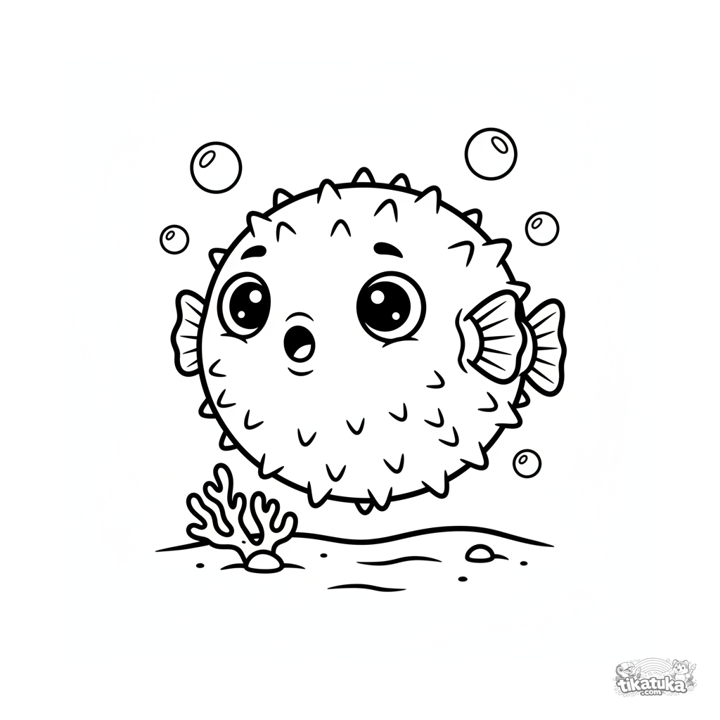Простая раскраска с круглым иглобрюхом у коралла на мелководье. Крупные формы, толстые контуры, для самых маленьких детей 2-3 лет.