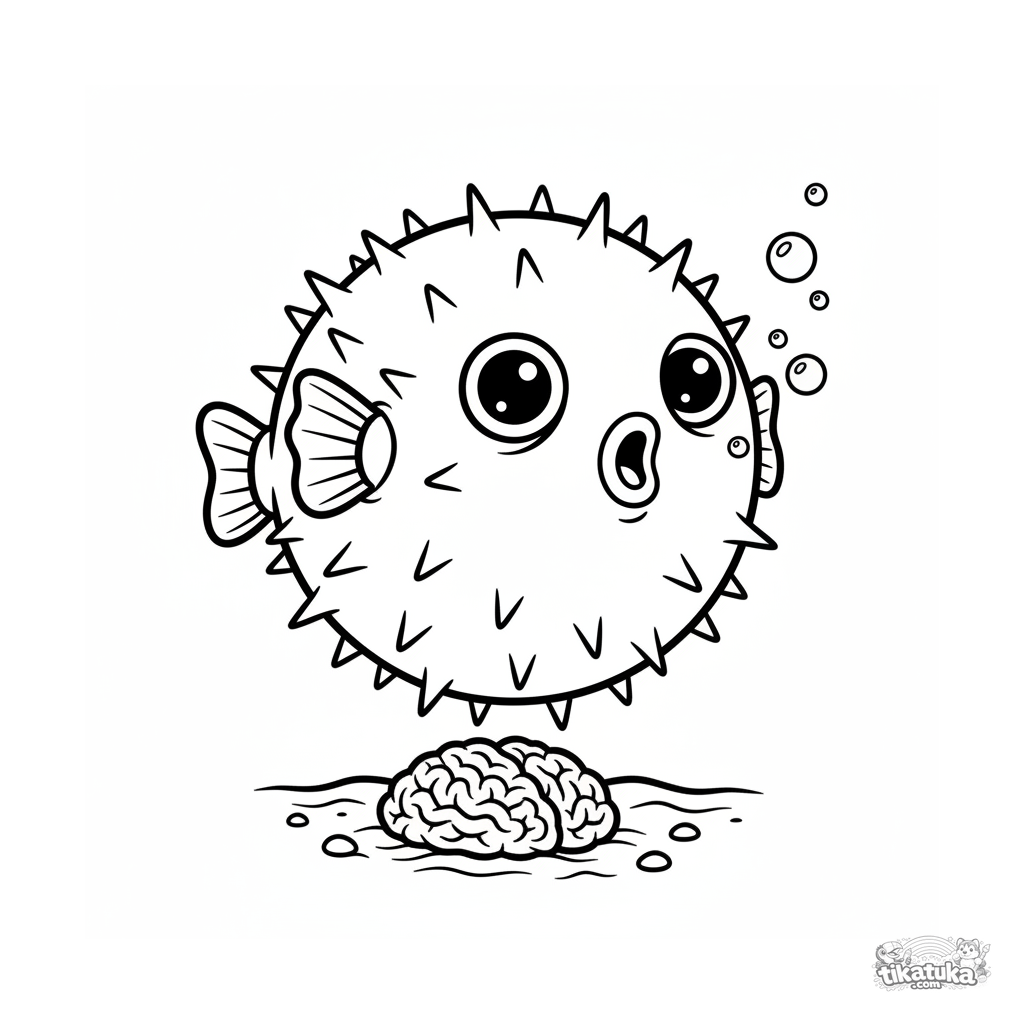 Смешная раскраска для детей 4-6 лет: удивленная рыба-шар надулась у коралла в солнечном мелководье. Веселый стиль 90-х с выразительной эмоцией.