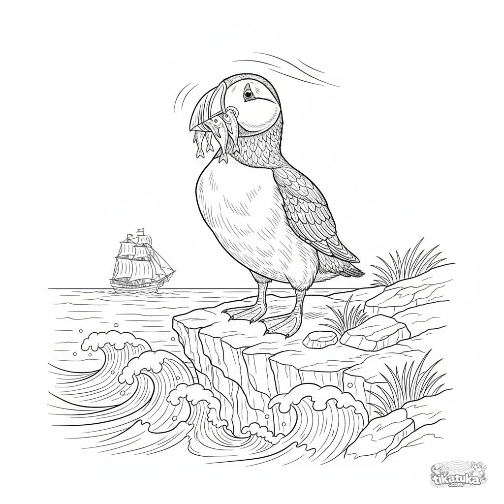 Детальная раскраска для детей 7-12 лет. Тупик с полосатым клювом стоит на скалистом утёсе у моря, держа в клюве несколько маленьких рыбок.