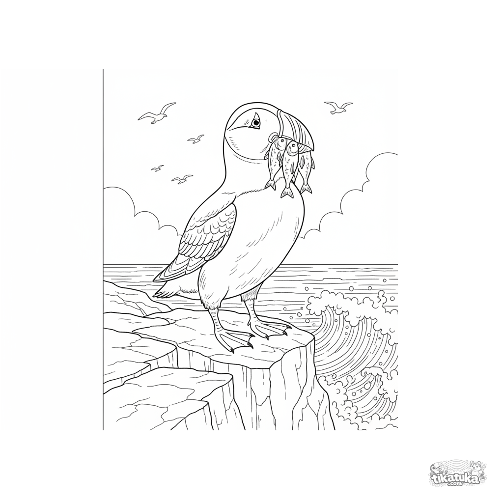 Сложная раскраска для детей 7-12 лет: детализированный тупик на скалистом утесе с рыбой в клюве. Отлично подходит для развития терпения и аккуратности.