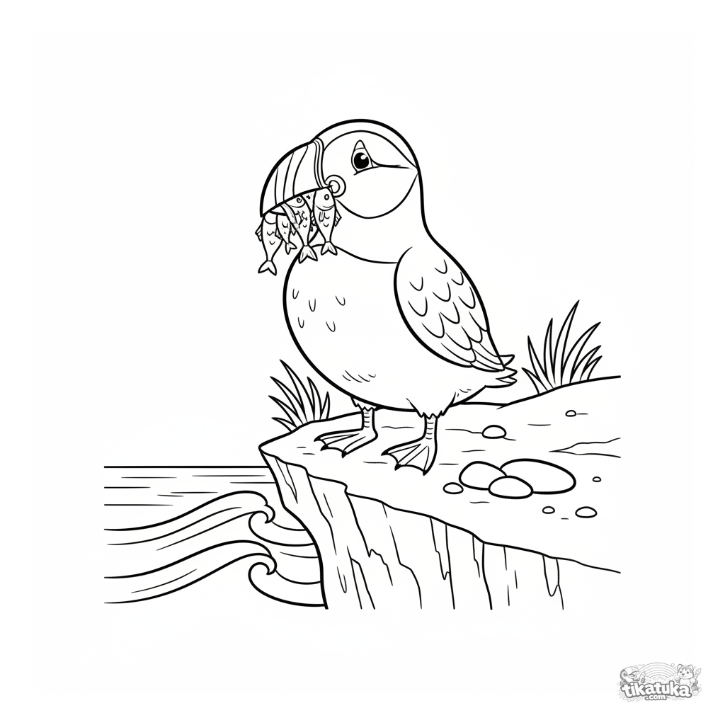 Детализированная раскраска для детей 7-12 лет: тупик с рыбой в клюве стоит на скалистом утесе над океаном. Много текстур и интересных элементов для раскрашивания.