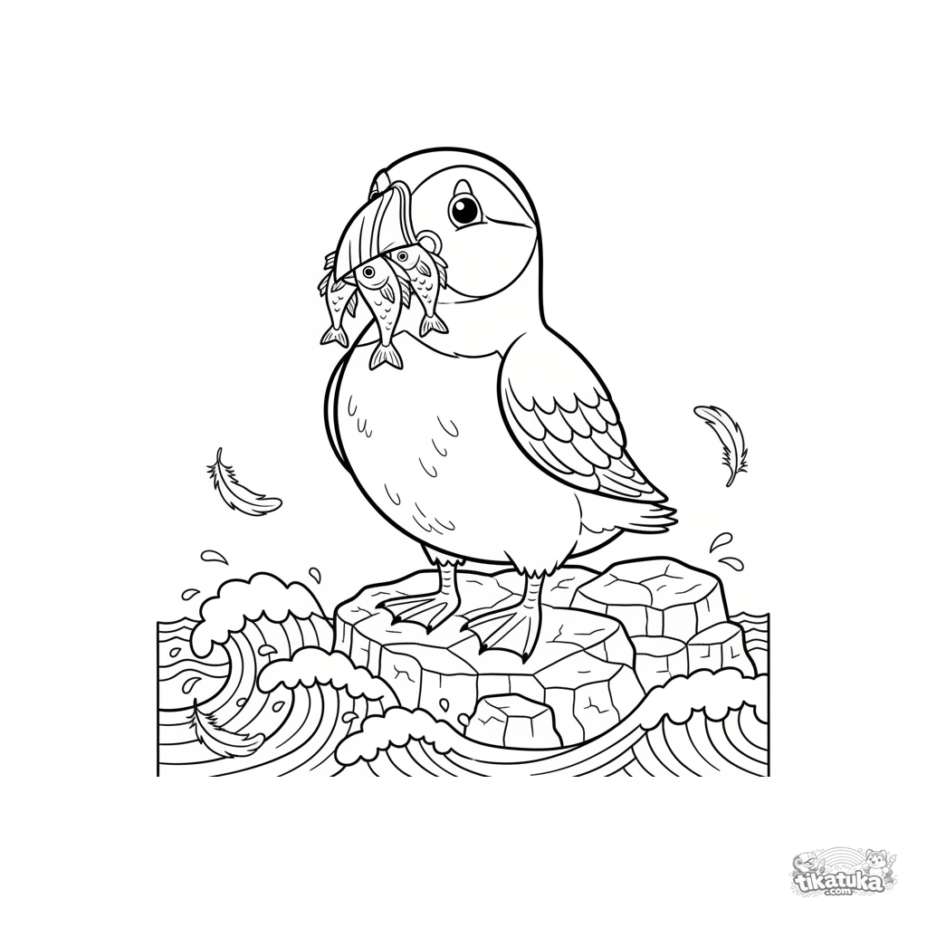 Раскраска с тупиком для детей 7-12 лет. Тупик стоит на морской скале с полным клювом блестящей рыбы, на фоне океанских волн и ветра.
