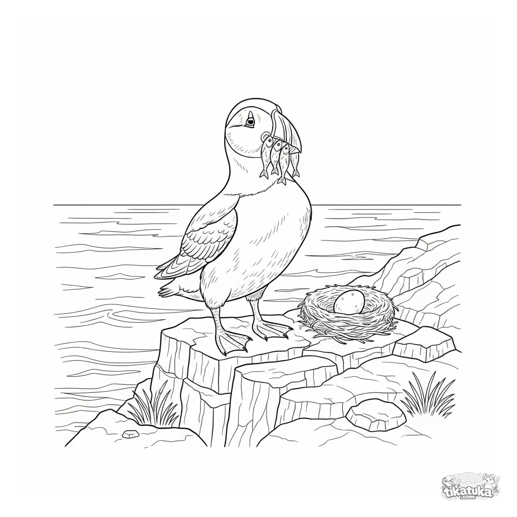 Детальная раскраска для детей 7-12 лет с тупиком. Тупик стоит на скалистом утесе с рыбой в клюве, на фоне океана и гнезда.