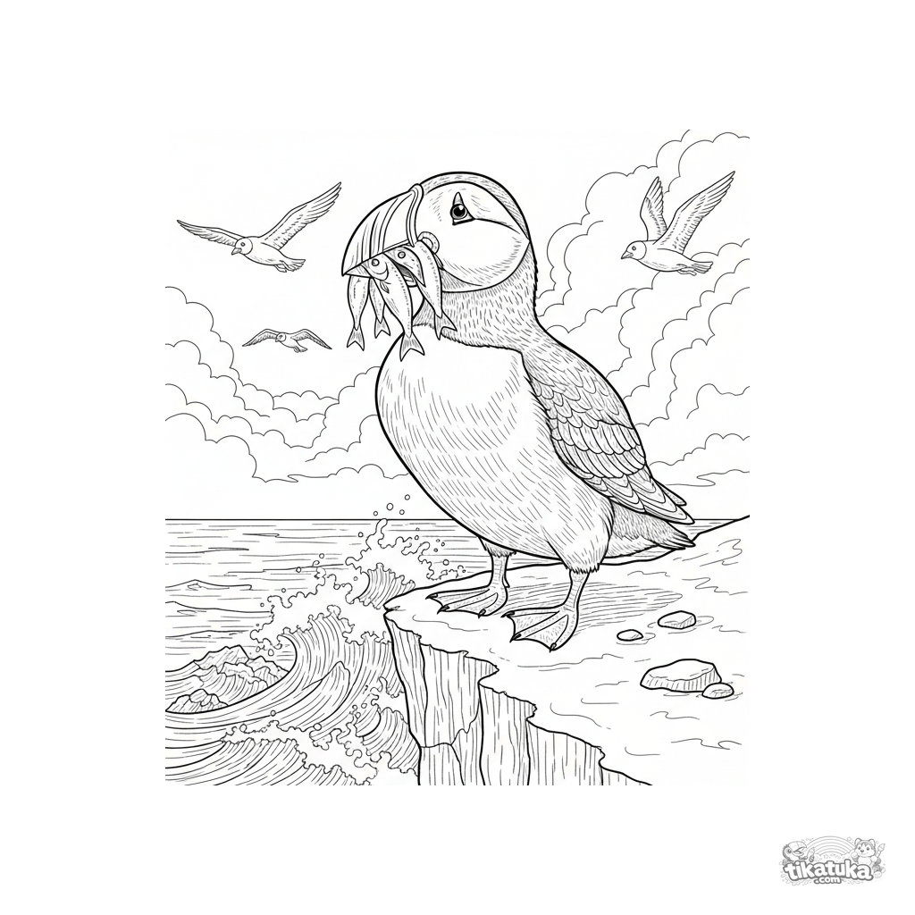 Сложная раскраска для детей 7-12 лет с тупиком. Птица с пойманной рыбой в клюве стоит на краю скалистого утёса над бушующим морем.