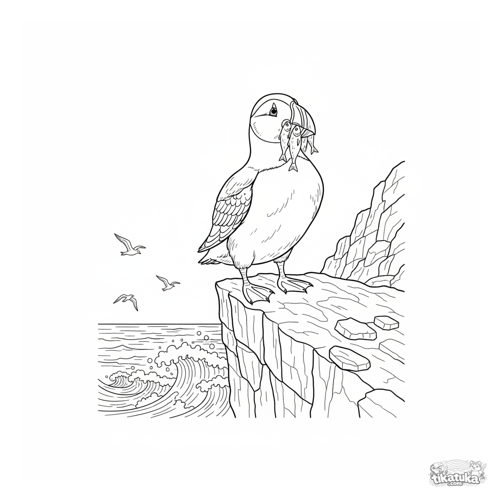 Сложная раскраска для детей 7-12 лет: тупик с рыбкой на краю скалистого утёса. Детализированный фон с океанскими волнами и текстурой камней.