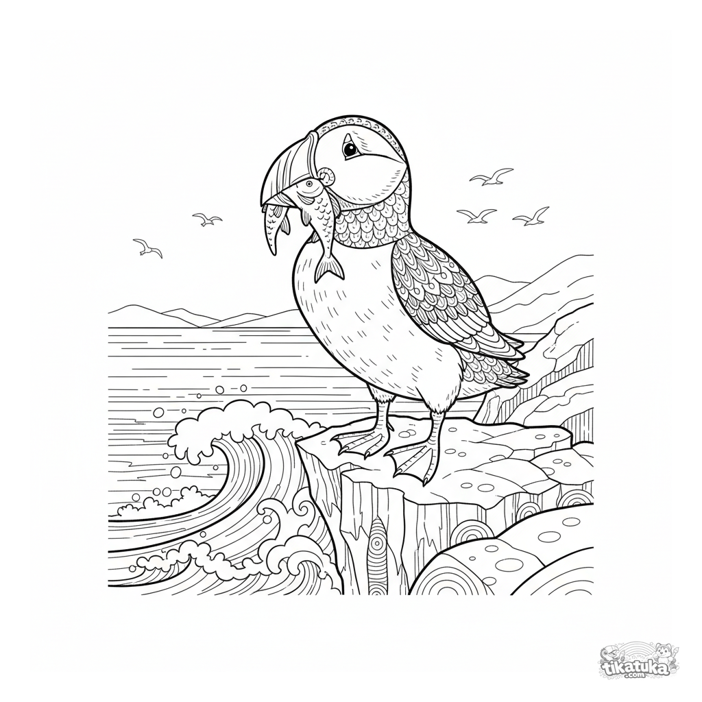 Раскраска для детей 7-12 лет: детализированный тупик с рыбой в клюве стоит на краю скалистого утеса. Высокая сложность, реалистичный стиль, морской пейзаж.