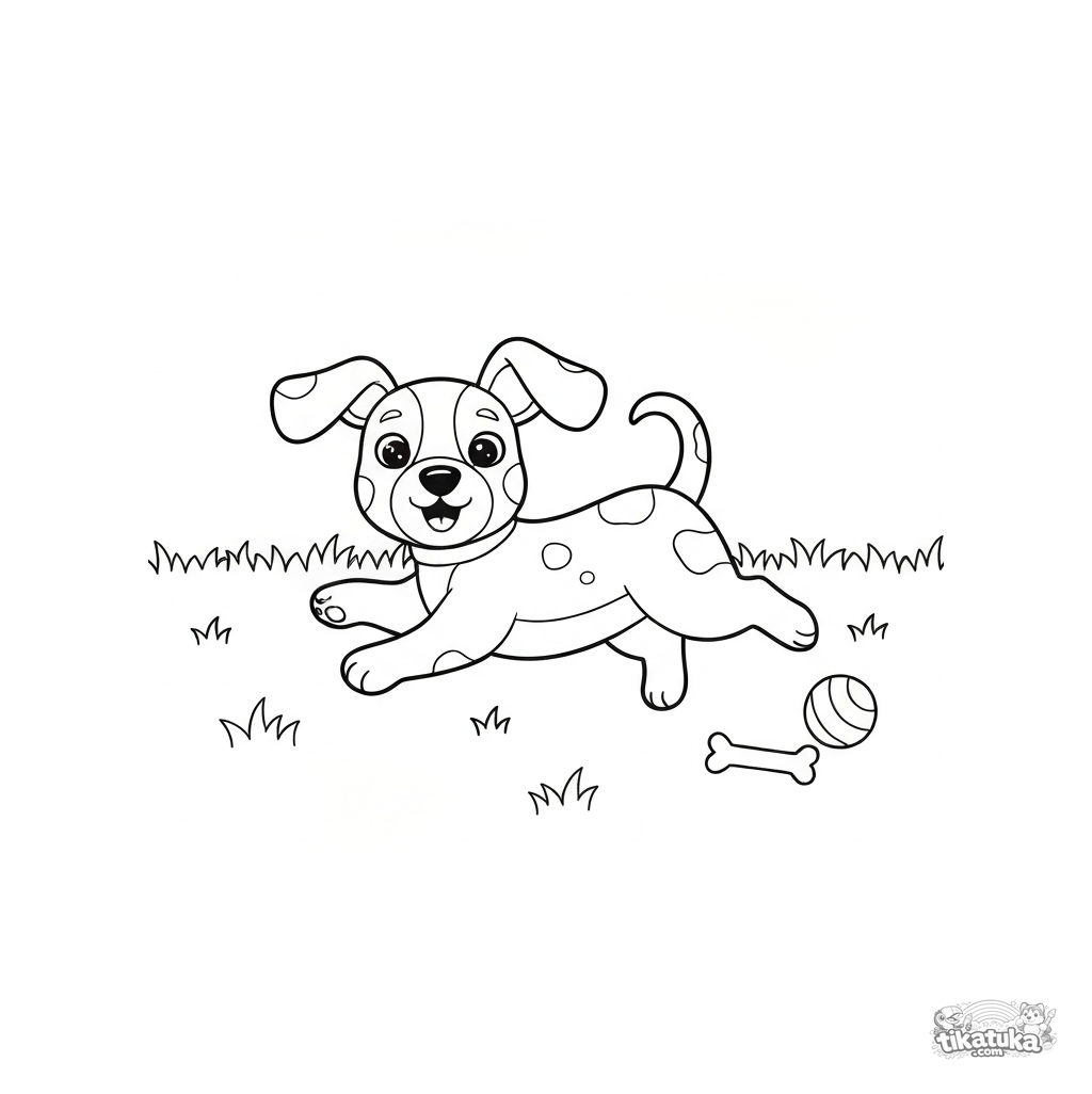 Раскраска для малышей: весёлый щенок гоняется за своим хвостом во дворе. Простые линии и формы, для детей 2-4 лет.