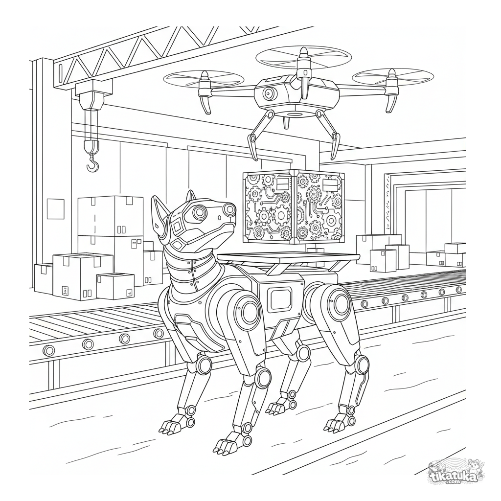 Детальная раскраска для детей 10-12 лет: реалистичный робот-грузчик в виде собаки на складе. Анатомия механического четвероногого, сцена погрузки с дроном.