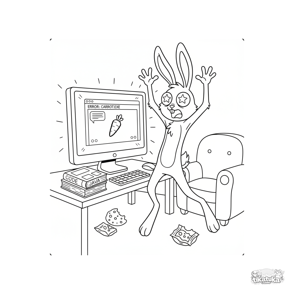 Раскраска для детей 7-12 лет: кролик в шоке от глюка на мониторе компьютера в комнате для чатов. Сцена с яркой перереакцией.