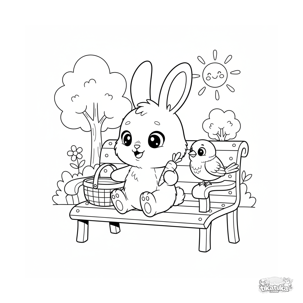 Раскраска для детей 7-9 лет: милый кролик делится морковкой с воробьем на парковой скамейке. Теплая сцена о дружбе и щедрости.