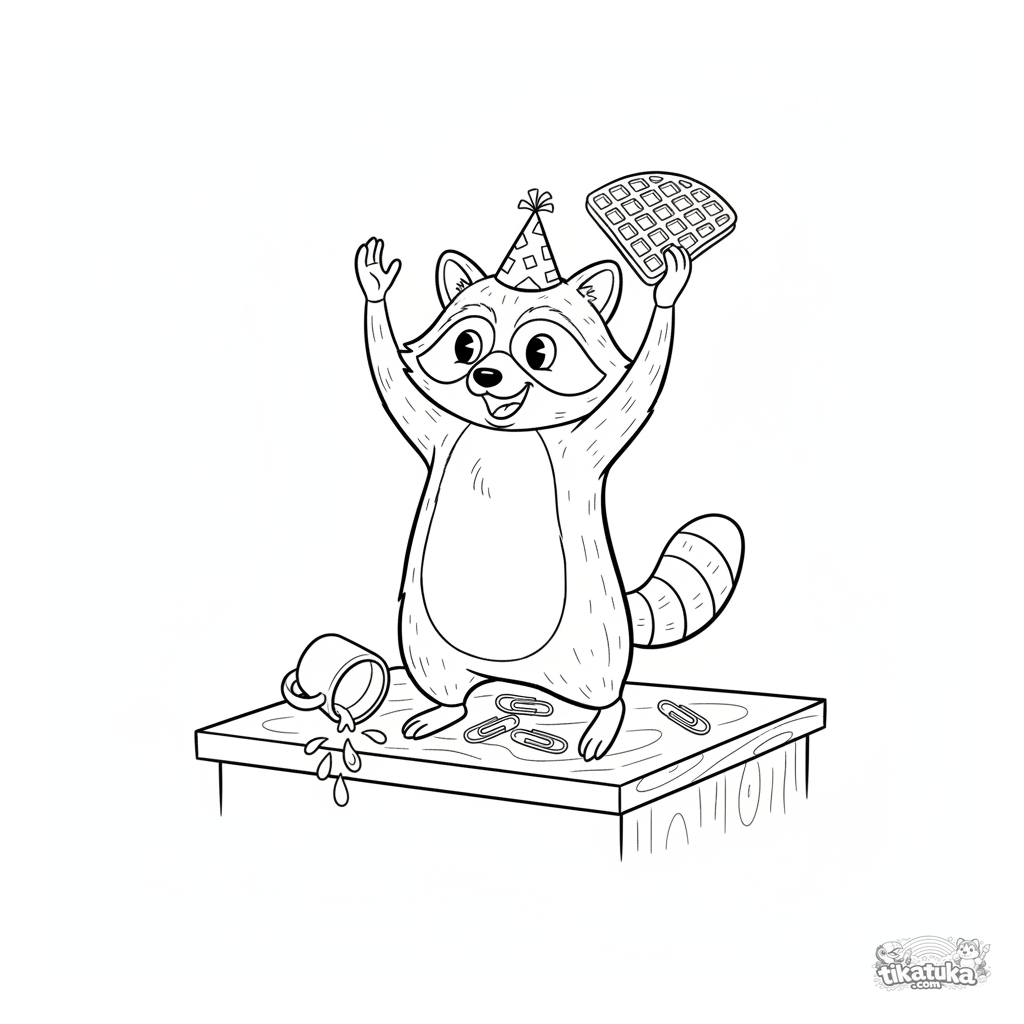 Раскраска для детей: енот в бумажной шляпке празднует на офисном столе с вафлей в лапах. Абсурдная и весёлая сцена в ретро-стиле резинового шланга.