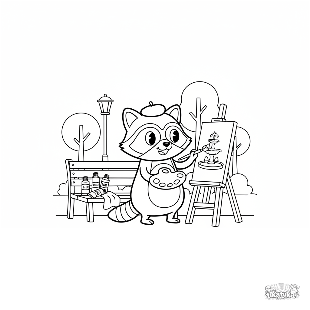 Раскраска для детей 7-9 лет: енот в берете рисует картину у скамейки в парке. Динамичная поза, ретро-стиль, развивает воображение.