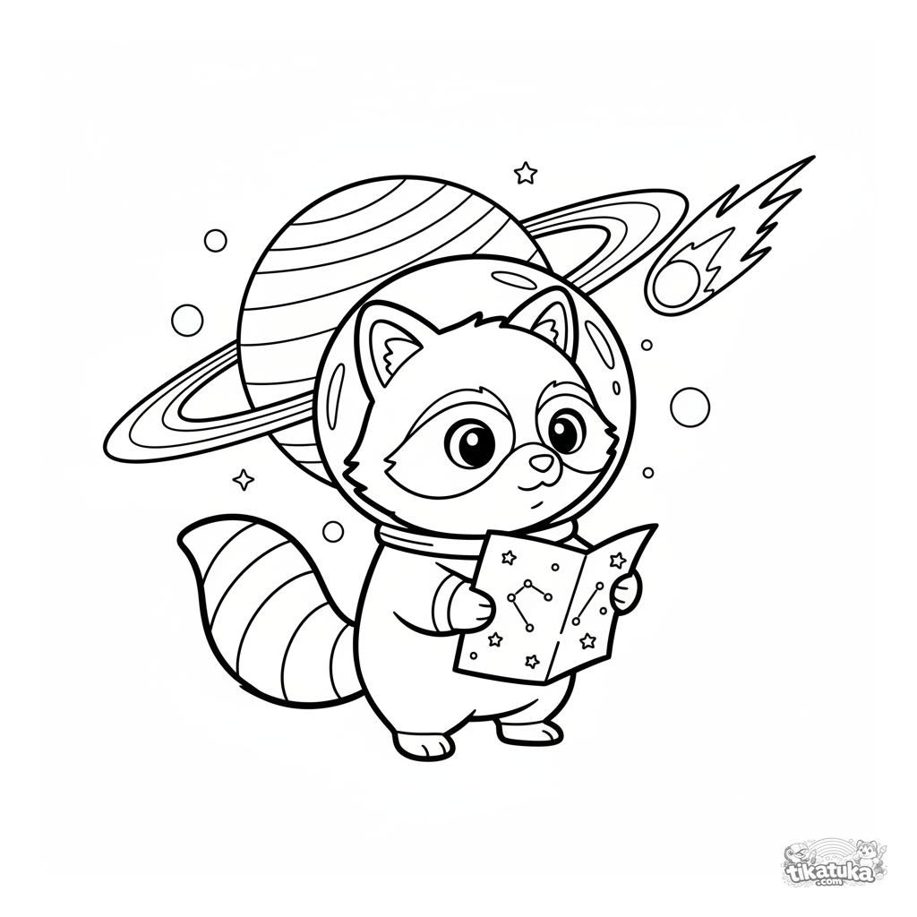Раскраска для детей 4-8 лет: енот-изобретатель Шмяк в скафандре исследует космос рядом с красивой кольцевой планетой.