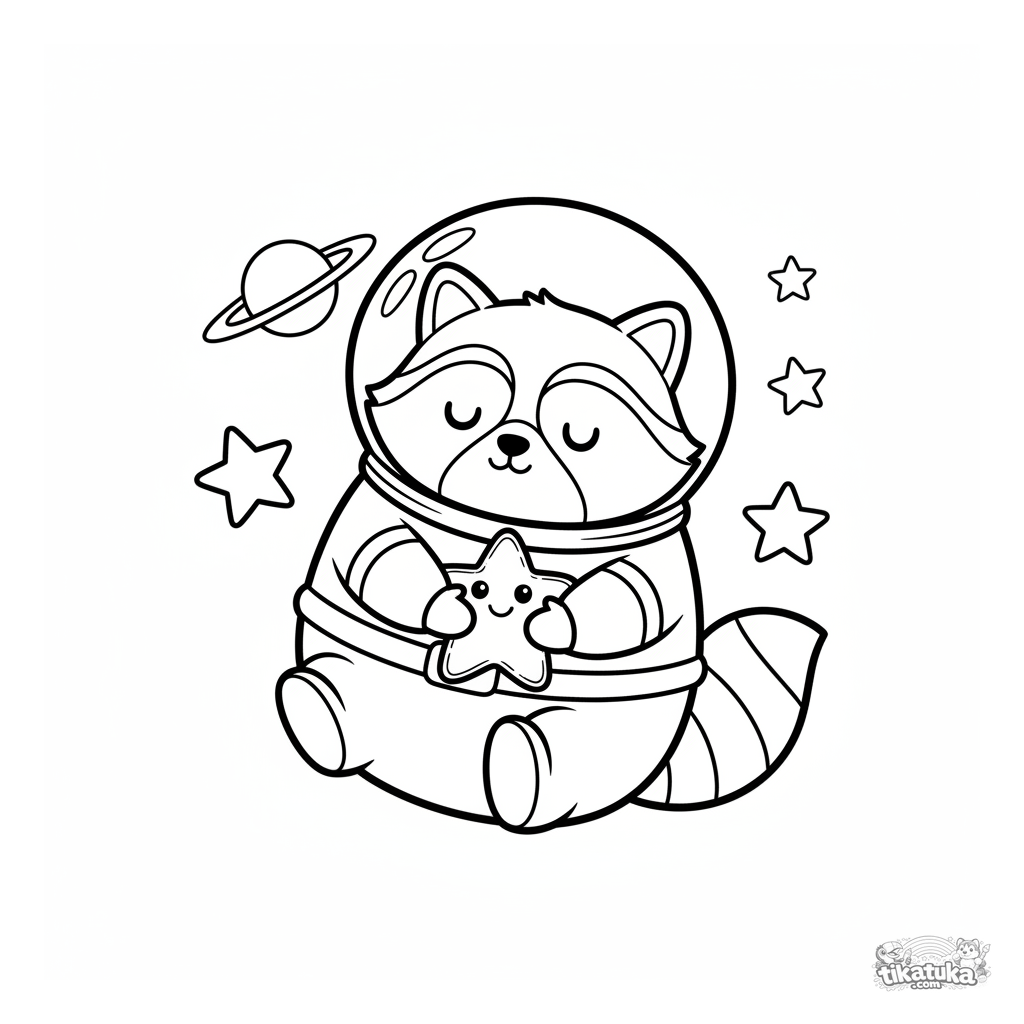 Раскраска на космическую тему для детей 4-6 лет: енот-космонавт Шмяк в скафандре весело парит в невесомости, держа инопланетную игрушку-звезду.