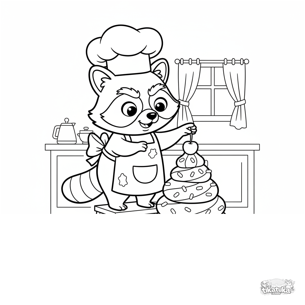Раскраска с енотом-пекарем Шмяком, украшающим гигантский кекс. Для детей 4-8 лет, развивает творческие способности.