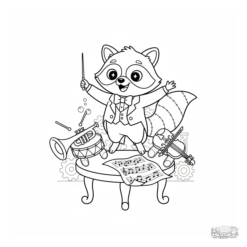 Раскраска с енотом-дирижёром Шмяком, ведущим игрушечный оркестр. Для детей 4-8 лет, знакомит с миром музыки.