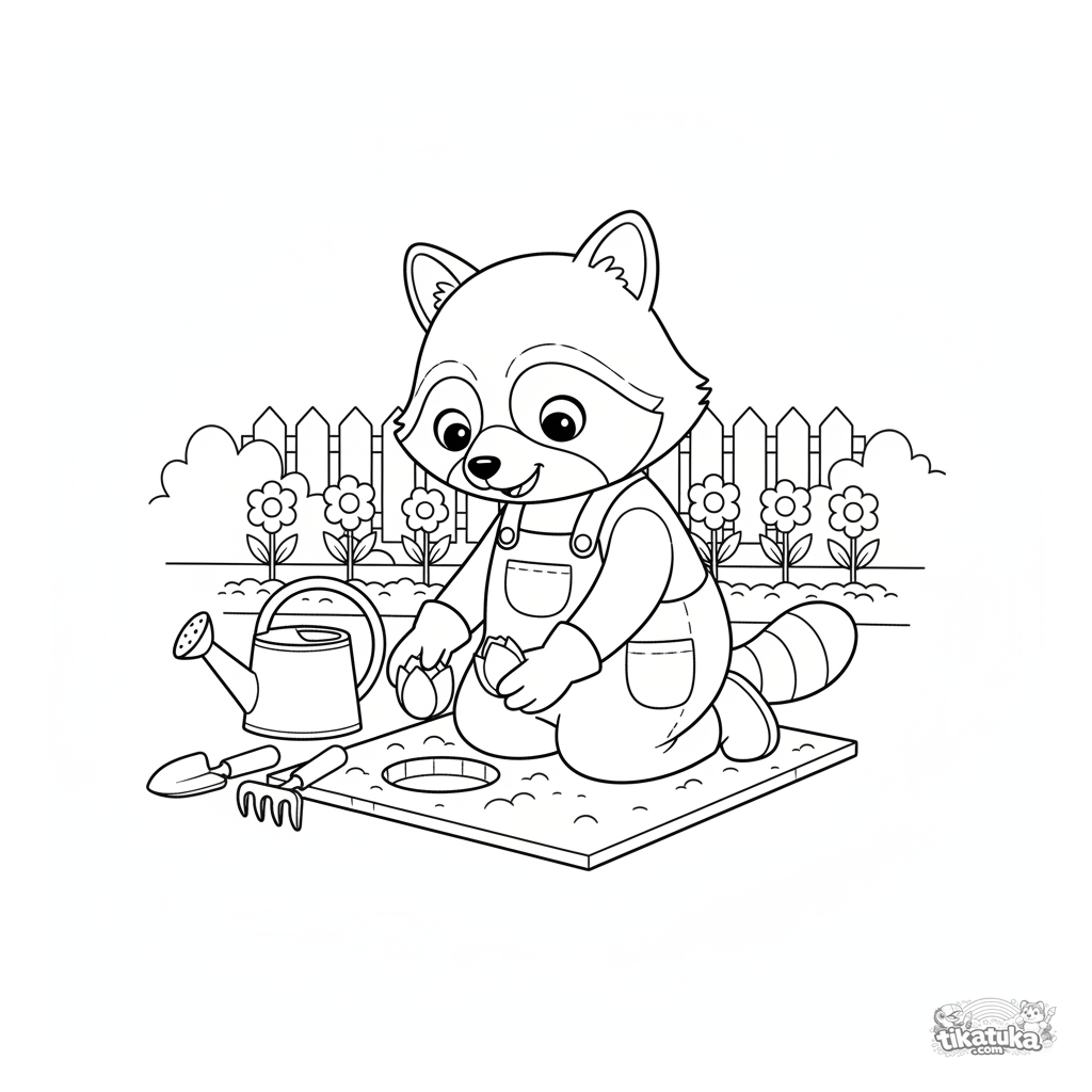 Спокойная раскраска для детей 4-8 лет: енот Шмяк занимается садоводством и сажает луковицы тюльпанов на своей грядке.
