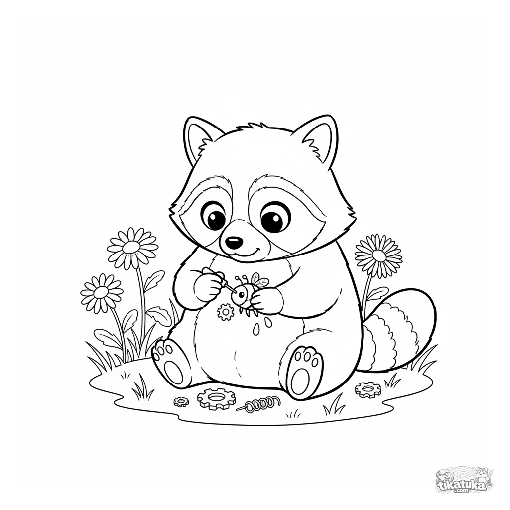 Раскраска для детей 4-6 лет: енот-изобретатель Шмяк собирает маленькую робопчелу в солнечном саду. Милая сцена для творческого раскрашивания.