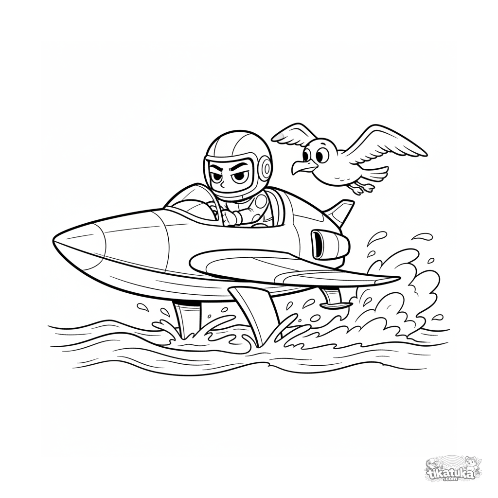 Раскраска для детей 7-9 лет: быстрый гоночный гидрофойл летит над волнами открытого моря. Динамичная поза, брызги и чайка создают ощущение скорости.