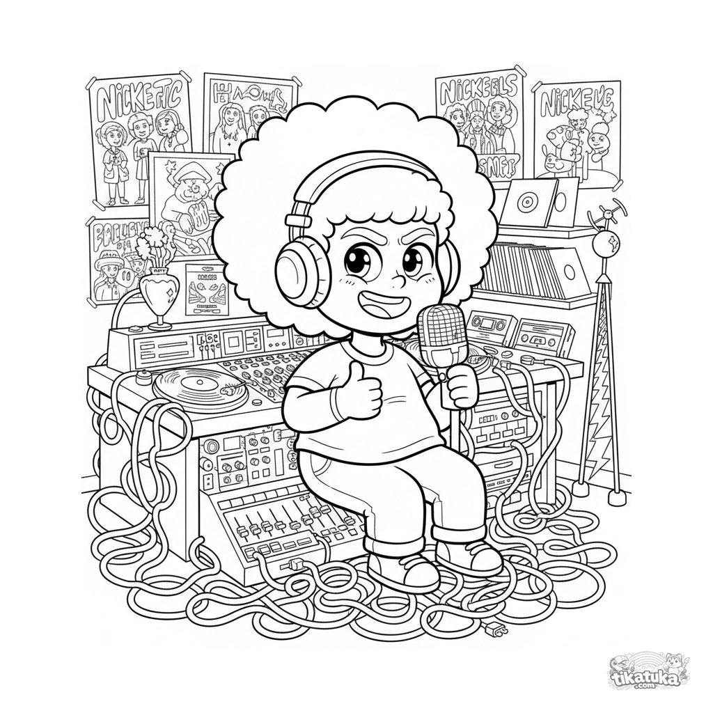 Раскраска для детей 10-12 лет: энергичный диджей ведёт передачу на пиратской радиостанции, устроенной в подвале. Хаотичная сцена с аппаратурой, плакатами и проводами.