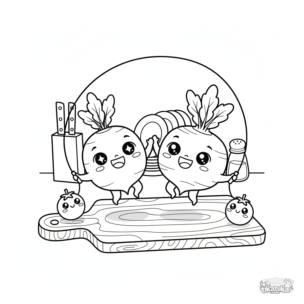 Раскраска с редькой и репой, прыгающими через скакалку. Для детей 4-6 лет. Веселые овощные друзья на кухонной доске.