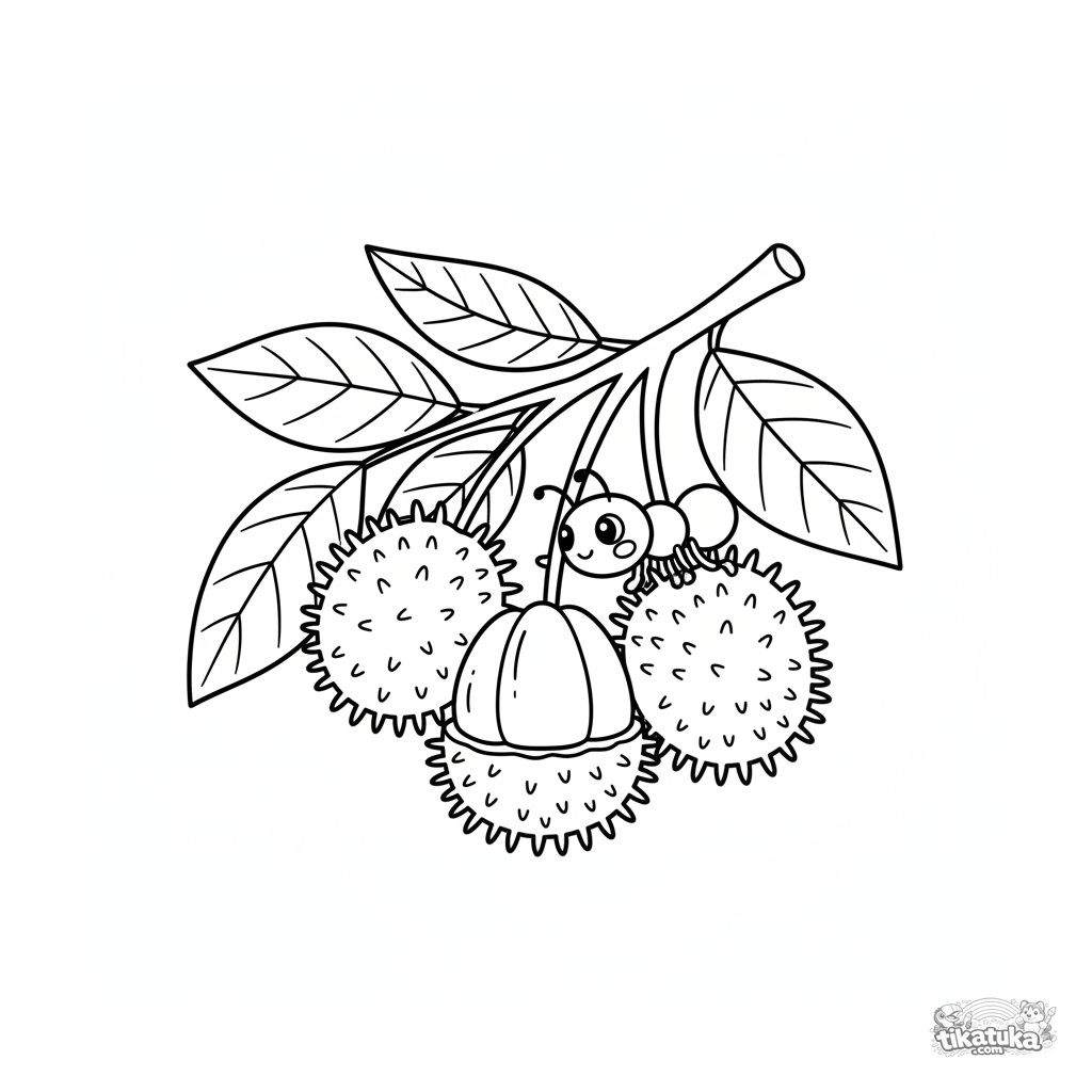 Раскраска для малышей: ветка с колючими рамбутанами и маленький дружелюбный муравей. Крупные простые формы, минимум деталей, широкие поля.