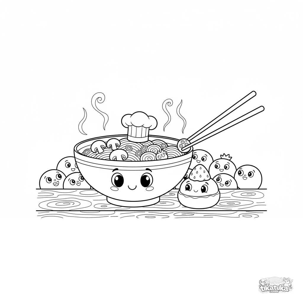 Раскраска для детей 7-9 лет: чаша рамена в шляпе повара угощает клубничные моти. Сцена на кухонной стойке с деталями.