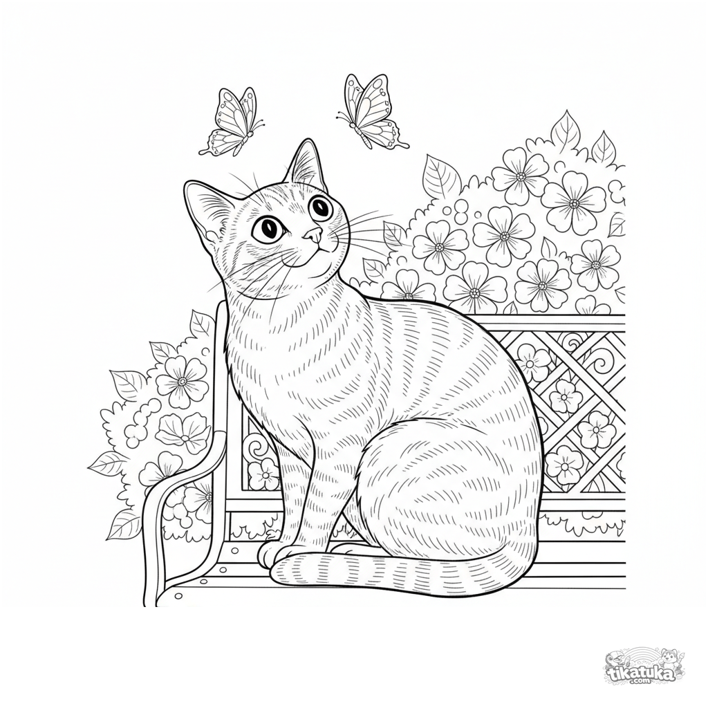 Детальная реалистичная раскраска для детей 10-12 лет: кот внимательно наблюдает за порхающими бабочками, сидя на кованой скамейке в весеннем парке.
