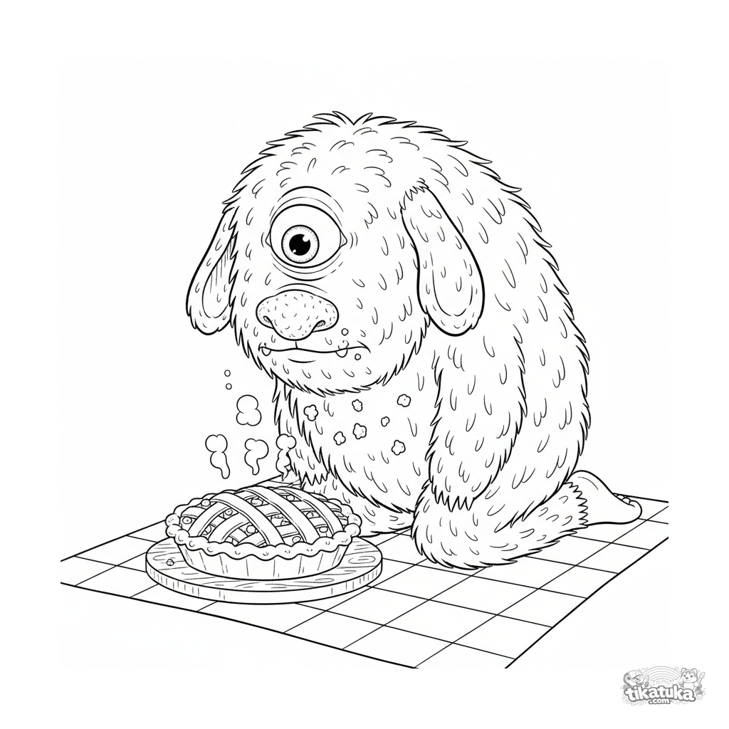 Детализированная реалистичная раскраска для детей 10-12 лет: мохнатый монстр с интересом нюхает ягодный пирог на пикнике. Текстуры и детали.