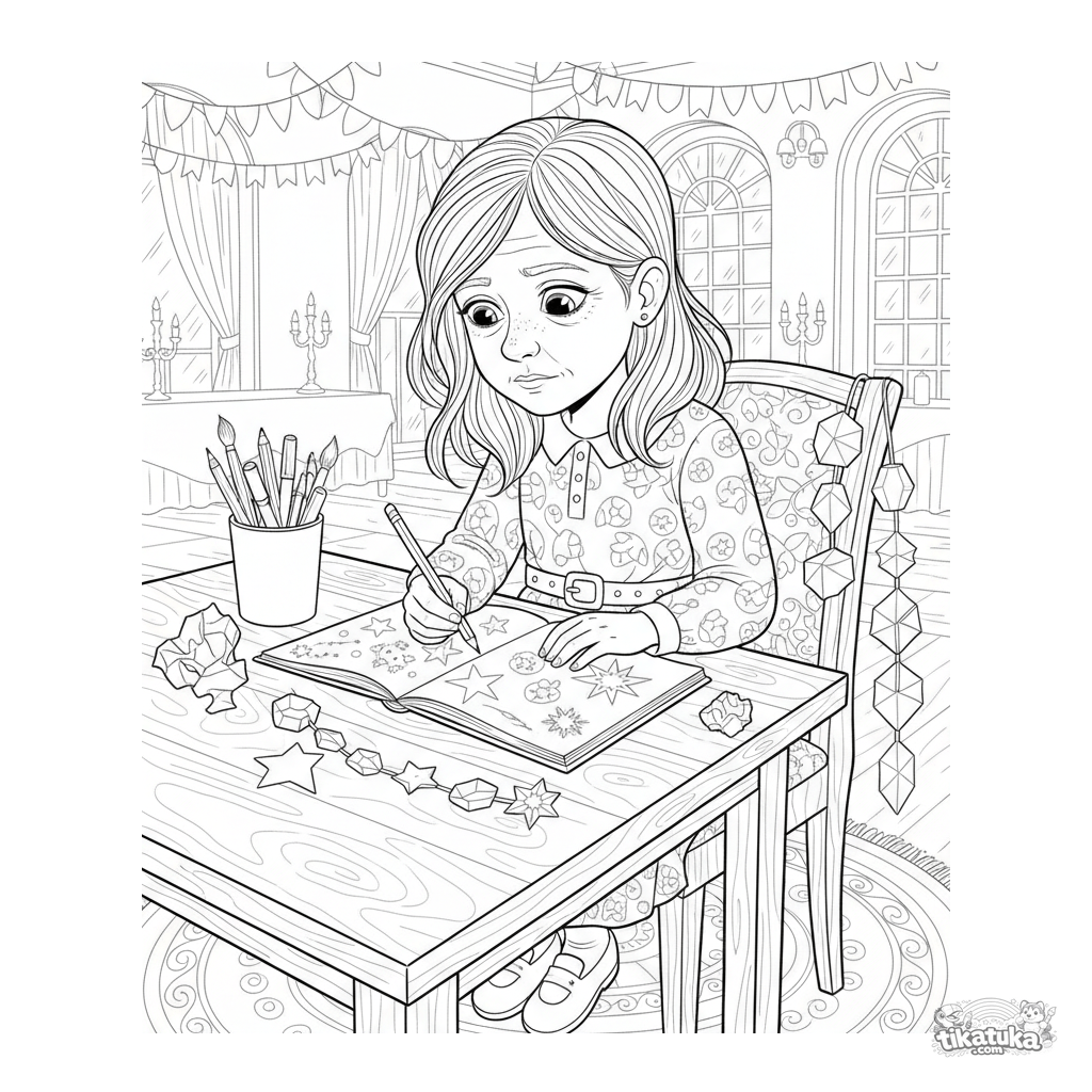 Раскраска для детей 10-12 лет в реалистичном стиле: девочка рисует эскизы украшений в праздничном зале. Сцена творческого процесса.