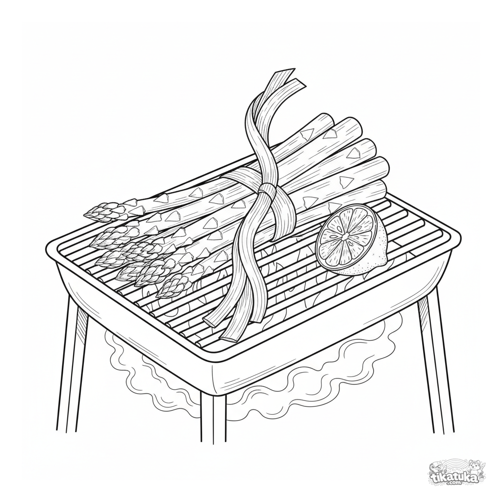 Раскраска для детей 10-12 лет: реалистичная связка спаржи с лимоном на садовом гриле. Высокая детализация, натуральные пропорции, чёткие контуры.