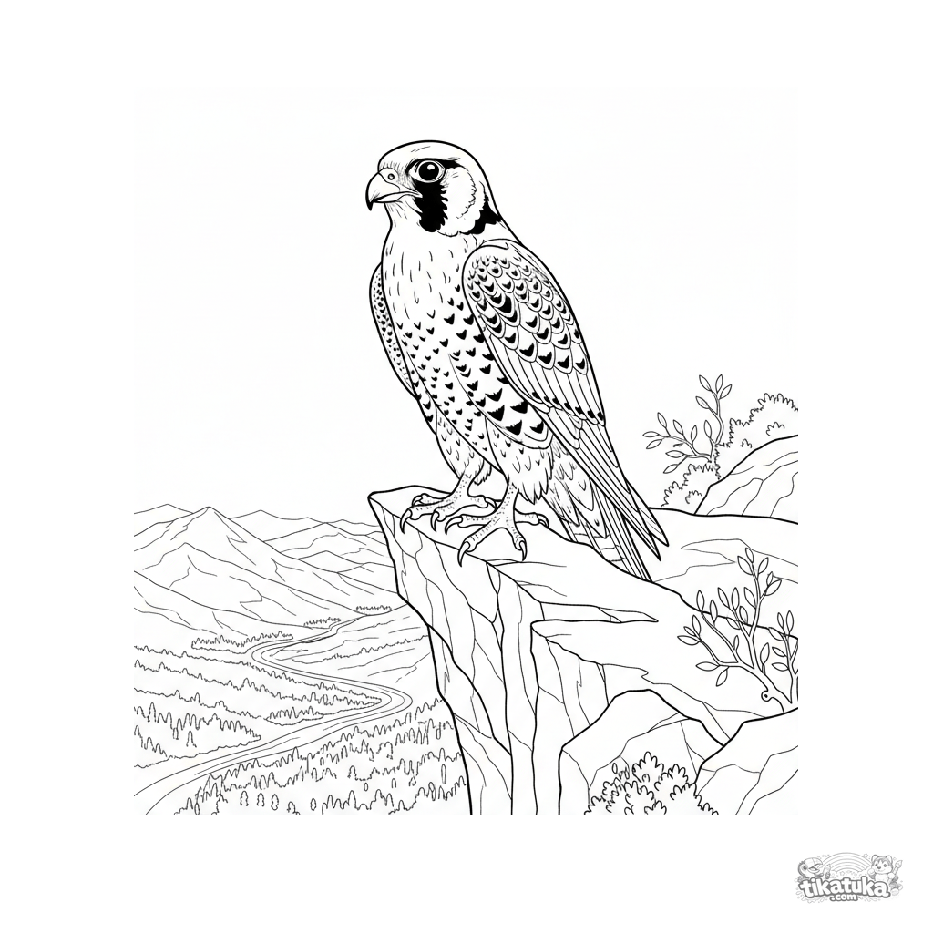 Раскраска для детей 7-12 лет: реалистичное изображение сапсана на краю скалистого утеса. Высокая детализация оперения и пейзажа для опытных художников.