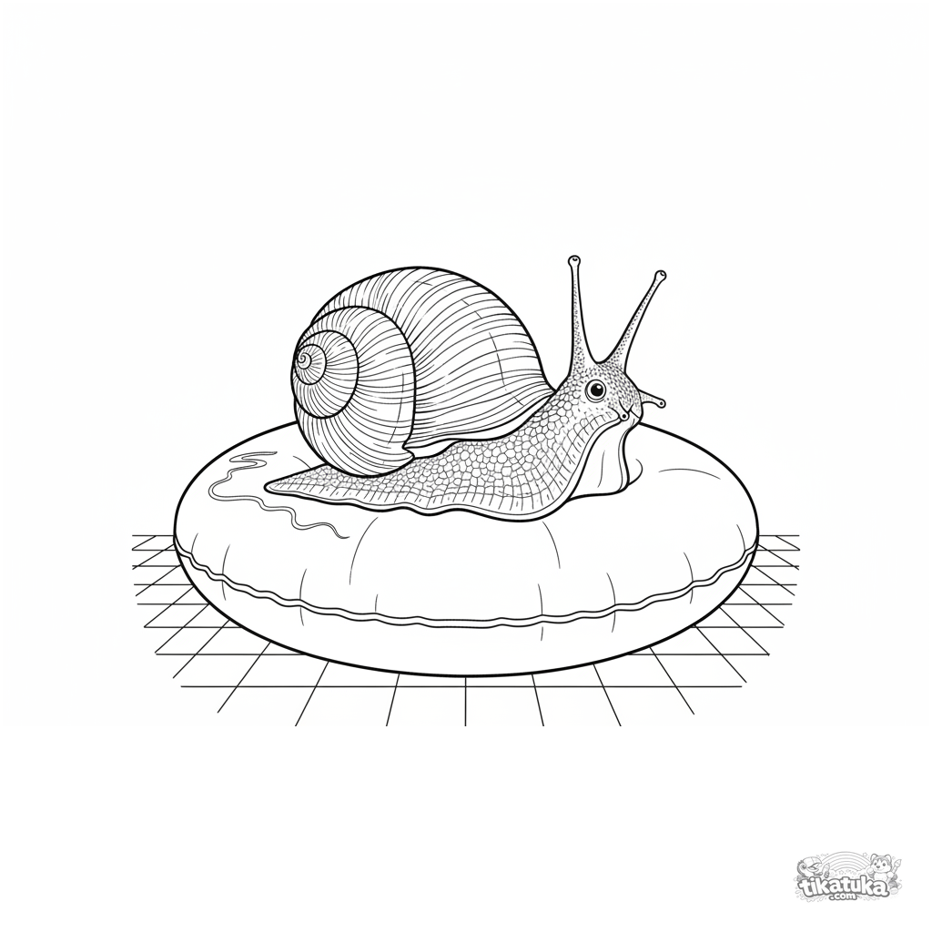 Сложная раскраска для детей 10-12 лет: детализированная морская улитка ползет по надувному кругу на дне бассейна. Текстуры раковины, анатомическая точность.
