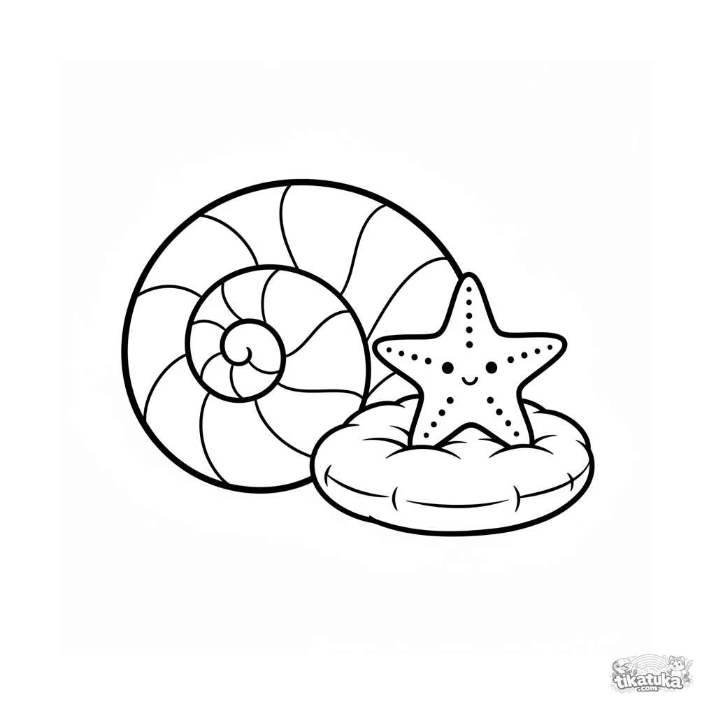 Простая реалистичная раскраска: большая спиральная ракушка и улыбающаяся морская звезда лежат на мягкой подушке. Крупные формы для детей 2-3 лет.