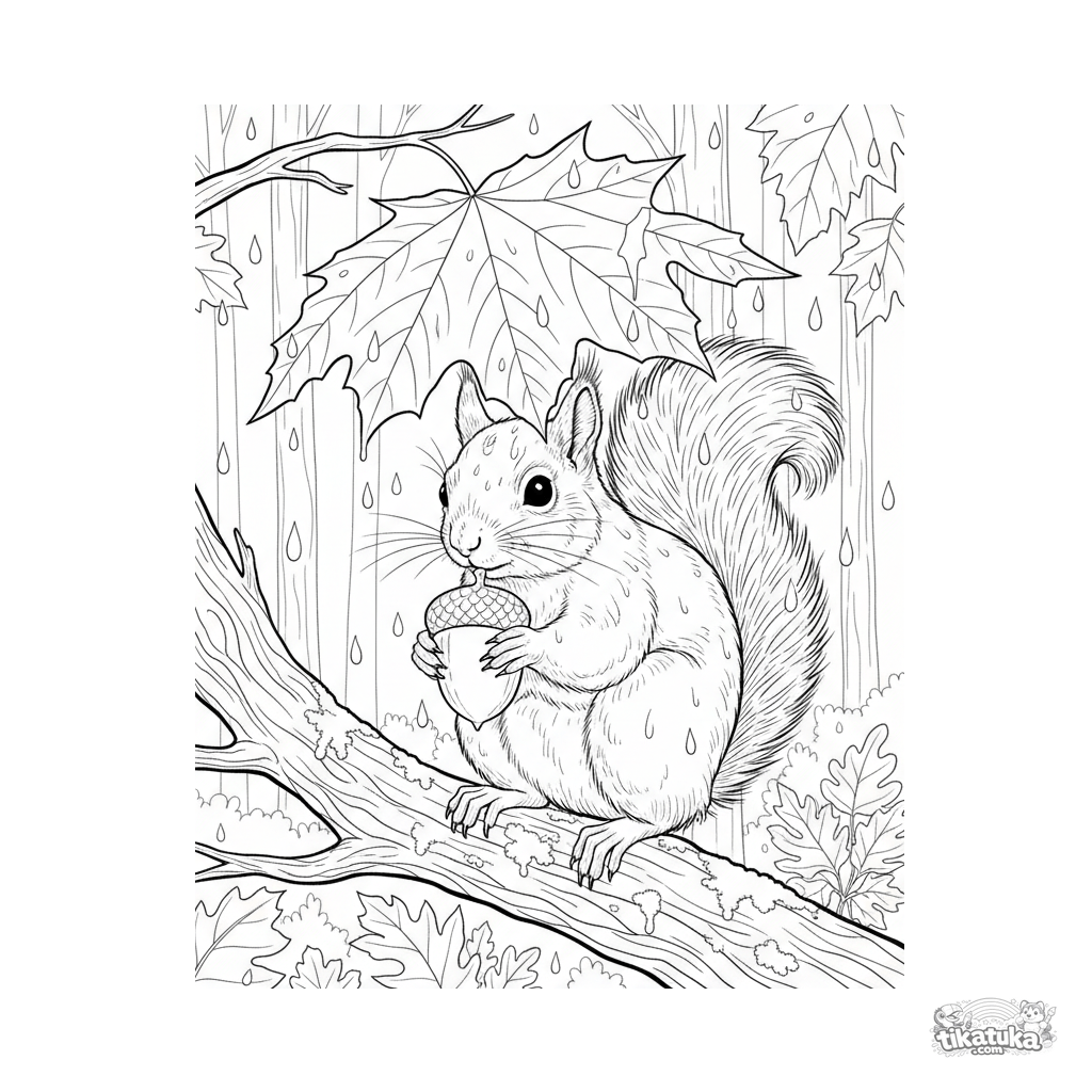 Детальная реалистичная раскраска для 10-12 лет: белка использует большой кленовый лист как зонтик, держа жёлудь, в осеннем дожде в лесу.