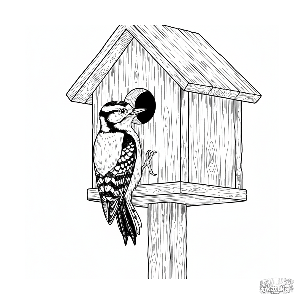 Раскраска для детей 10-12 лет: реалистичный дятел изучает вход в деревянный скворечник. Детальная прорисовка, идеально для любителей природы и птиц.