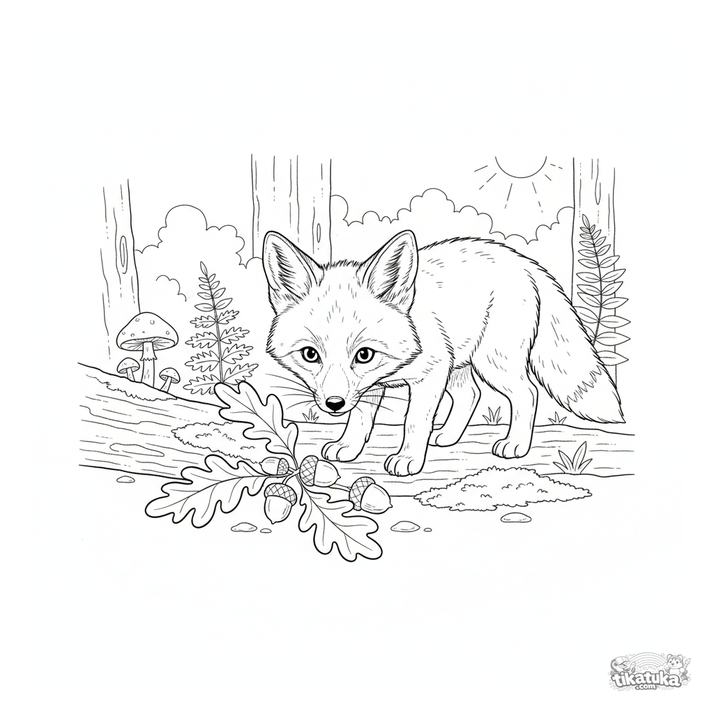 Раскраска для детей 4-6 лет: любопытный лисёнок исследует осенний лес. Изображены дубовые листья, желуди и грибы. Контуры четкие, тело полностью видно.